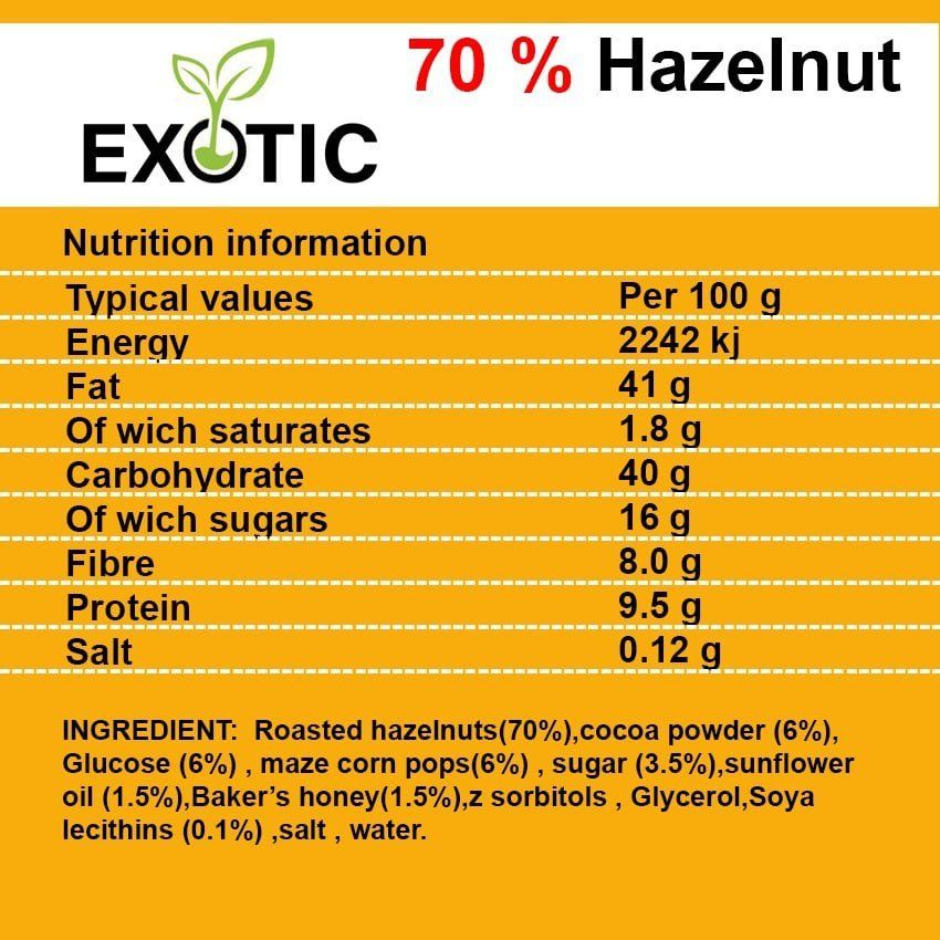 Not only is hazelnut bar tasty and fun to eat, it is also rich in nutrients and have high content of protein, fats, vitamins and minerals. It is loaded with nutrients and healthy fats. It contains Essential Fatty acids, Protein, Fiber, Vitamin E, Thiamin, Magnesium, Copper, Manganese, Folate, Phosphorus, Potassium and Zinc. It is a rich source of mono and poly unsaturated fats and contains a good amount of omega-6 and omega-9 and fatty acids such as Oleic Acid. Hazelnut bar also provides significant amounts of antioxidants.